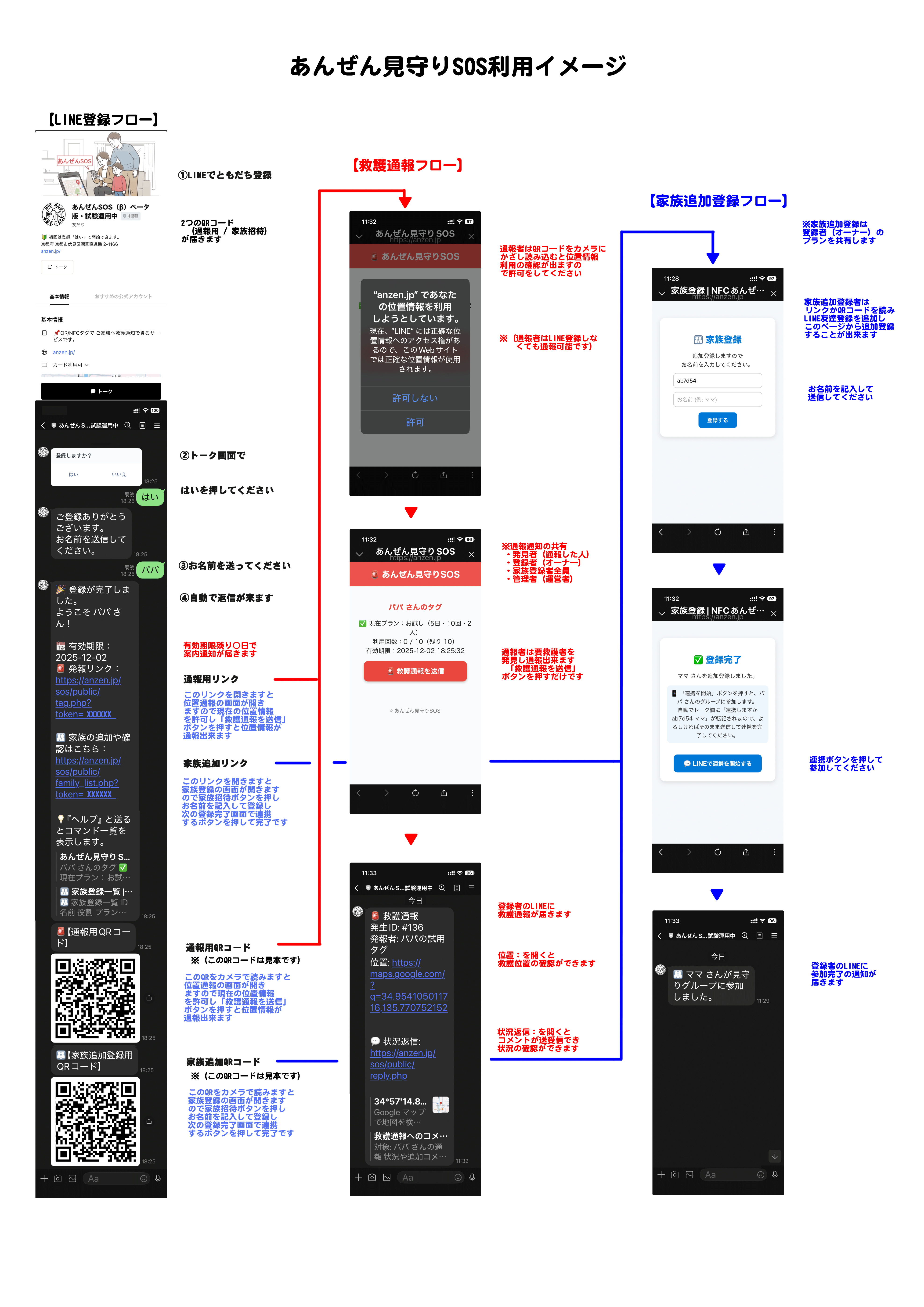 - QRコード2種類(通報用・家族追加用)がLINEで届きます
